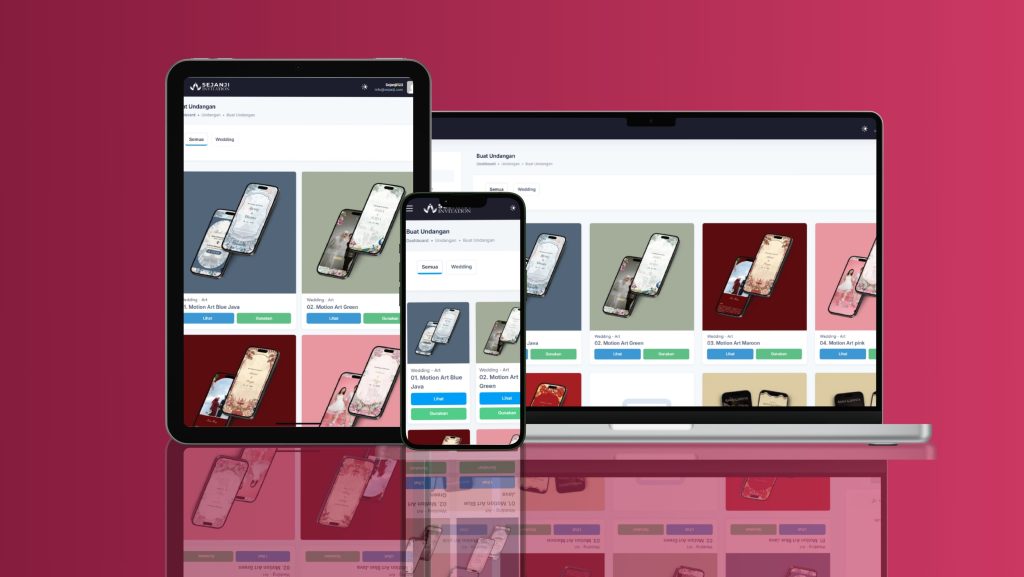 Buat undangan website praktis dan nyaman. Tanpa harus didepan laptop berjam-jam. Cukup pilih tema, edit detail acara, upload foto, semua bisa selesai dalam hitungan menit.
